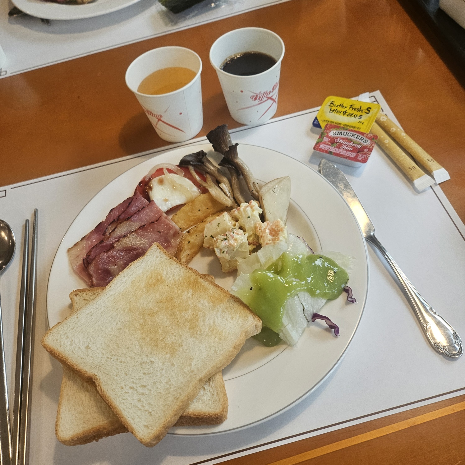 빵 베이컨 소세지 샐러드류 커피와 쥬스가 있었고