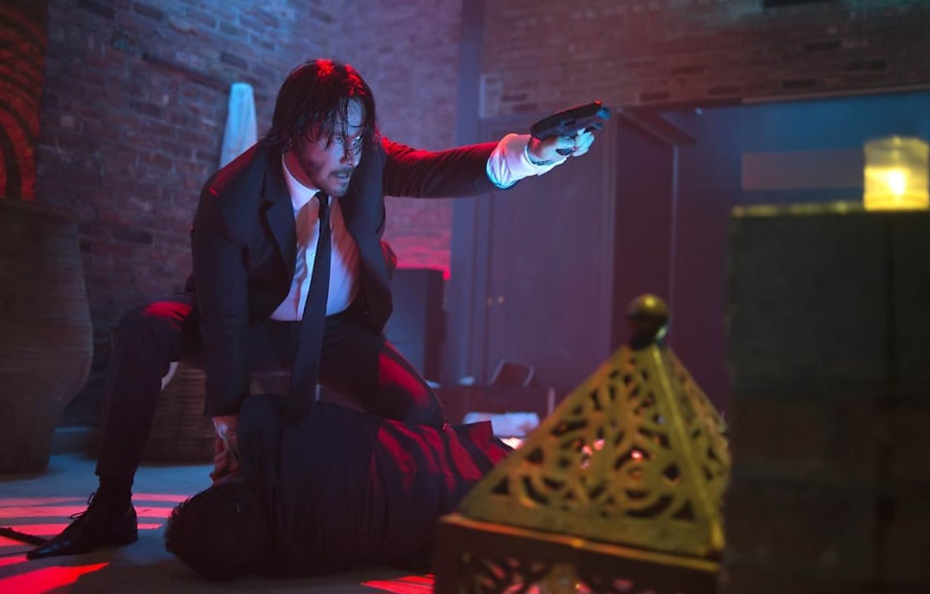 가장 인상적인 부분은 액션의 연출이다. 이 영화의 액션은 기존의 헐리우드식 파괴적이고 과장된 액션이 아니라, 무술, 총기술, 카체이싱을 현실감 있게 조화시킨 ‘건 카타(Gun Kata)’ 스타일을 도입했다. 모든 장면이 계산된 듯한 움직임과 리듬을 갖고 있어, 마치 무용을 보는 듯한 느낌을 준다. 특히 키아누 리브스는 수개월간 실제 총기 훈련과 무술 수련을 통해 완벽하게 캐릭터에 몰입했으며, 대부분의 액션을 대역 없이 소화했다.